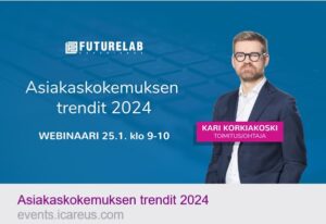Futurelab Experiencen perustaja, toimitusjohtaja Kari Korkiakoski on kirjoittanut asiakaskokemuksen trendeistä jo vuodesta 2015. Aihe ja webinaari, joka on saanut aina suuren suosion. Tervetuloa mukaan 25.1. klo 9-10 webinaariin kuulemaan vuoden 2024 10 trendistä ja ilmiöistä!